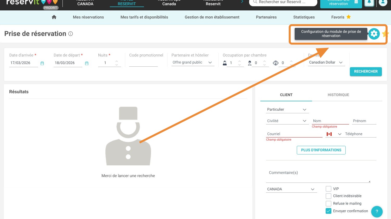 Ouverture des paramètres : Cliquez sur l'icône d'engrenage située en haut à droite pour accéder aux options de prise de réservation.