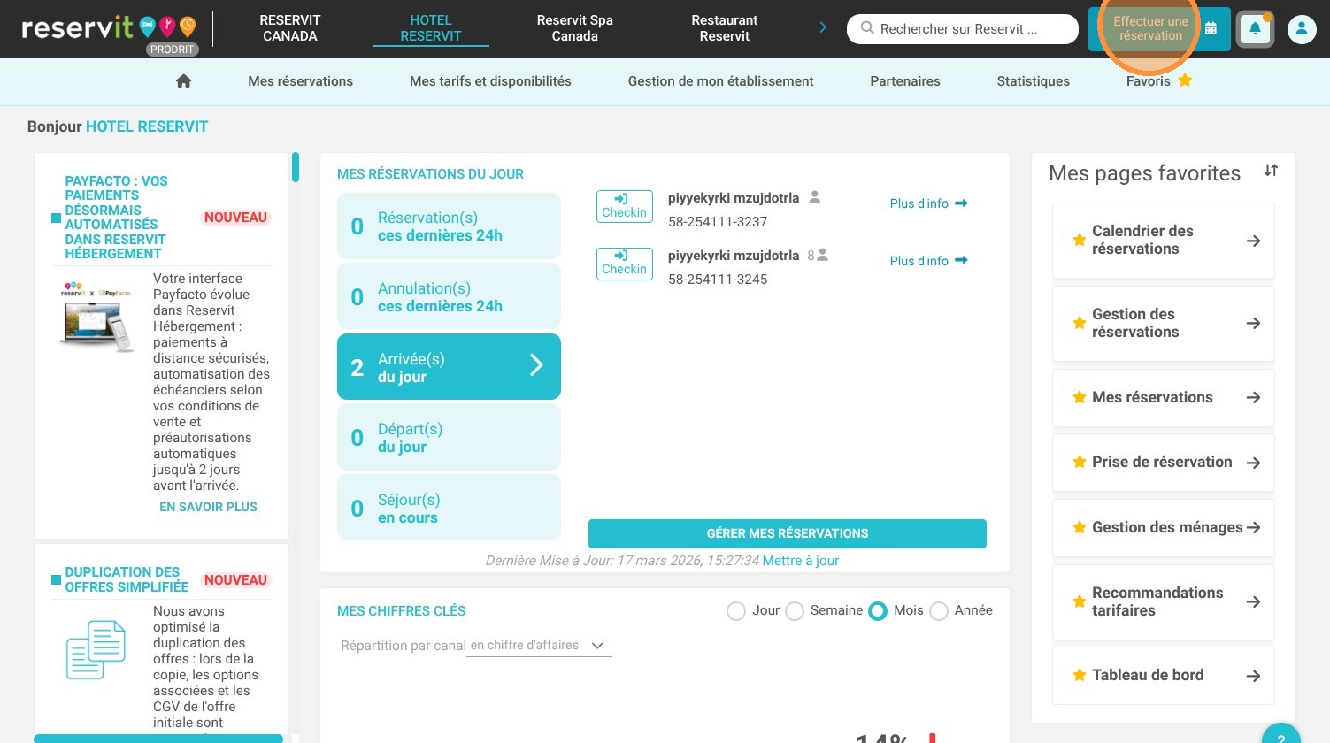 Accès à l'interface : Rendez-vous dans le menu « Effectuer une réservation » de votre interface Reservit Hébergement.