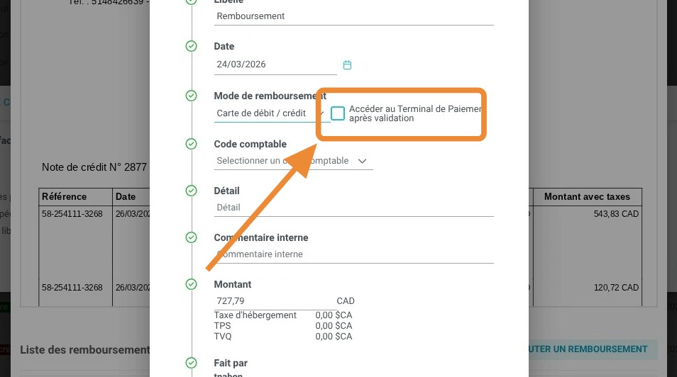Astuce ! Si vous procédez à un remboursement sur la carte de crédit utilisée lors de la transaction depuis Reservit, n'oubliez de cocher la case ''Accéder au Terminal"