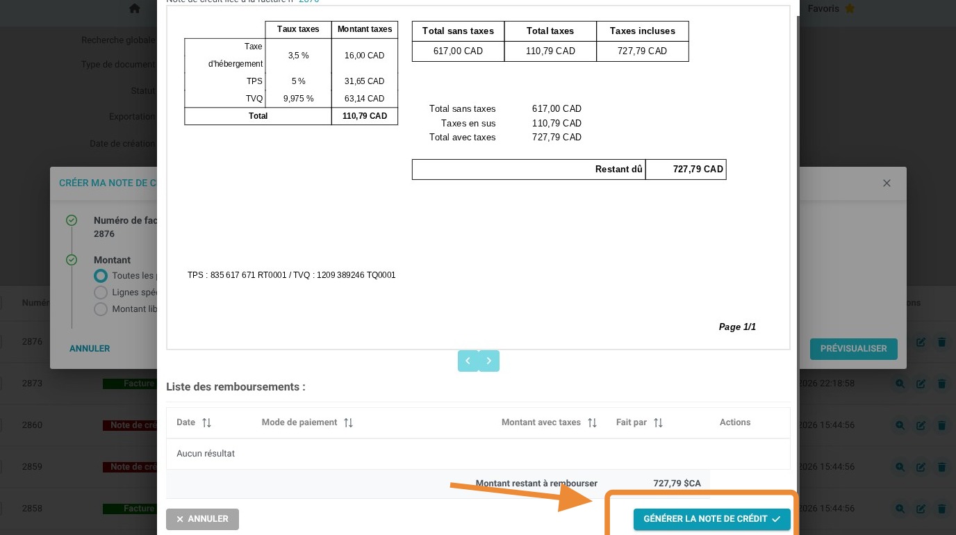 9. Si le document est correct, cliquez "Générer la note de crédit" ou "Générer l'Avoir"