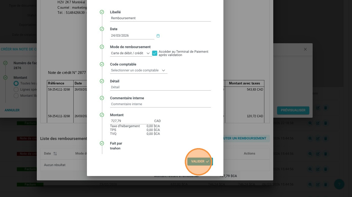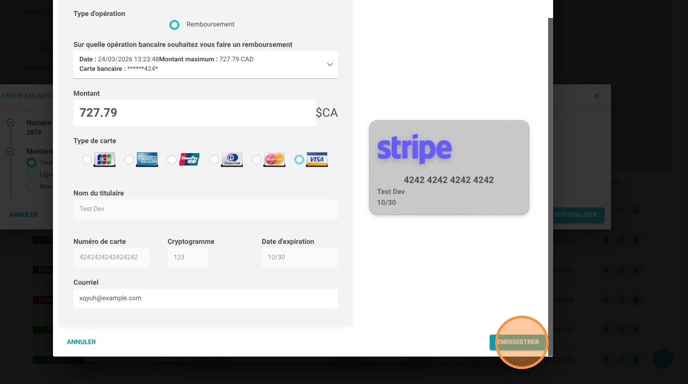 13. Le terminal virtuel s'ouvre alors. Validez les informations de remboursement et cliquez "Enregistrer"