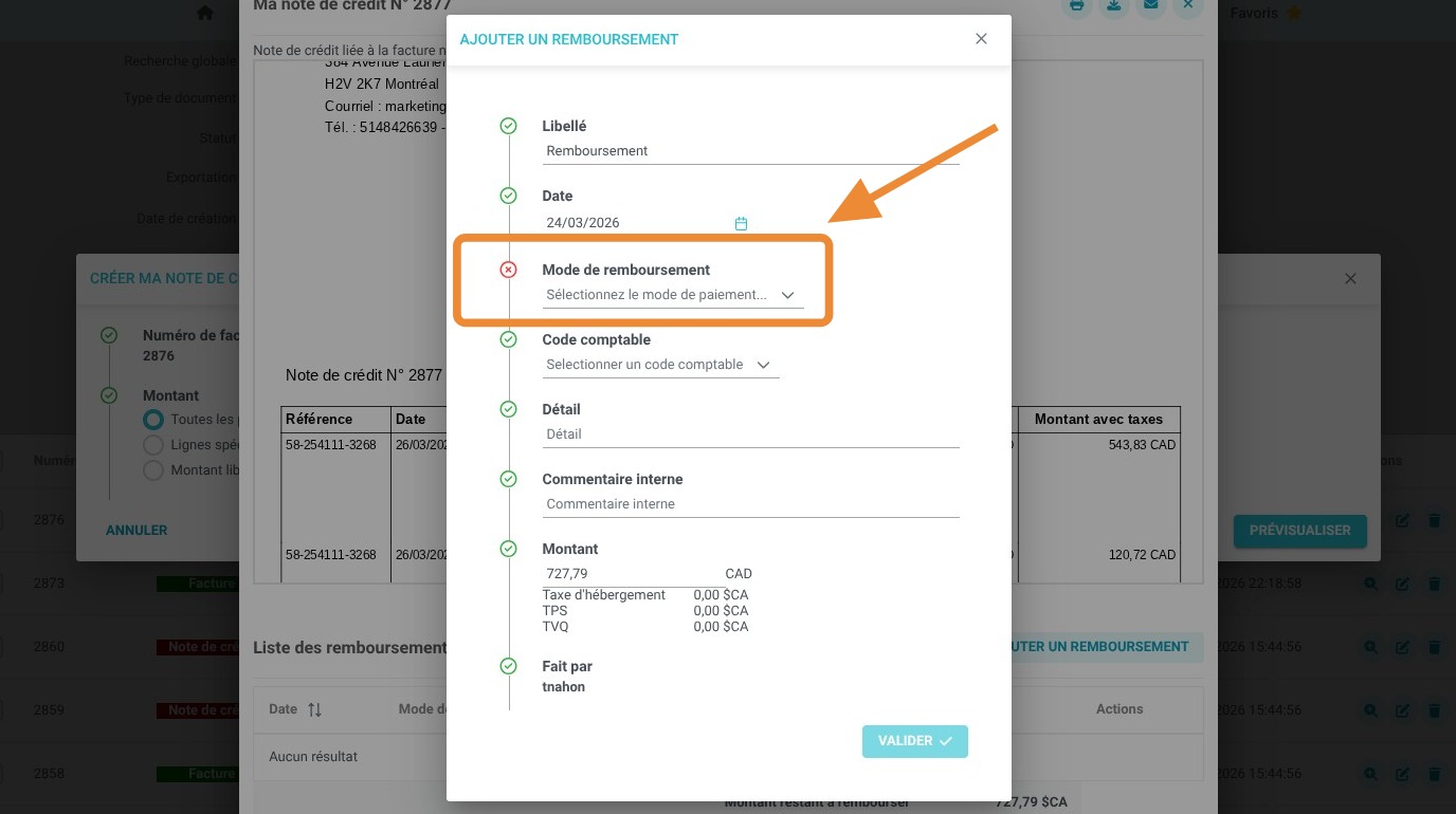 12. Cliquez sur "Valider". Si vous remboursez le montant en dehors de Reservit, passez à l'étape 15