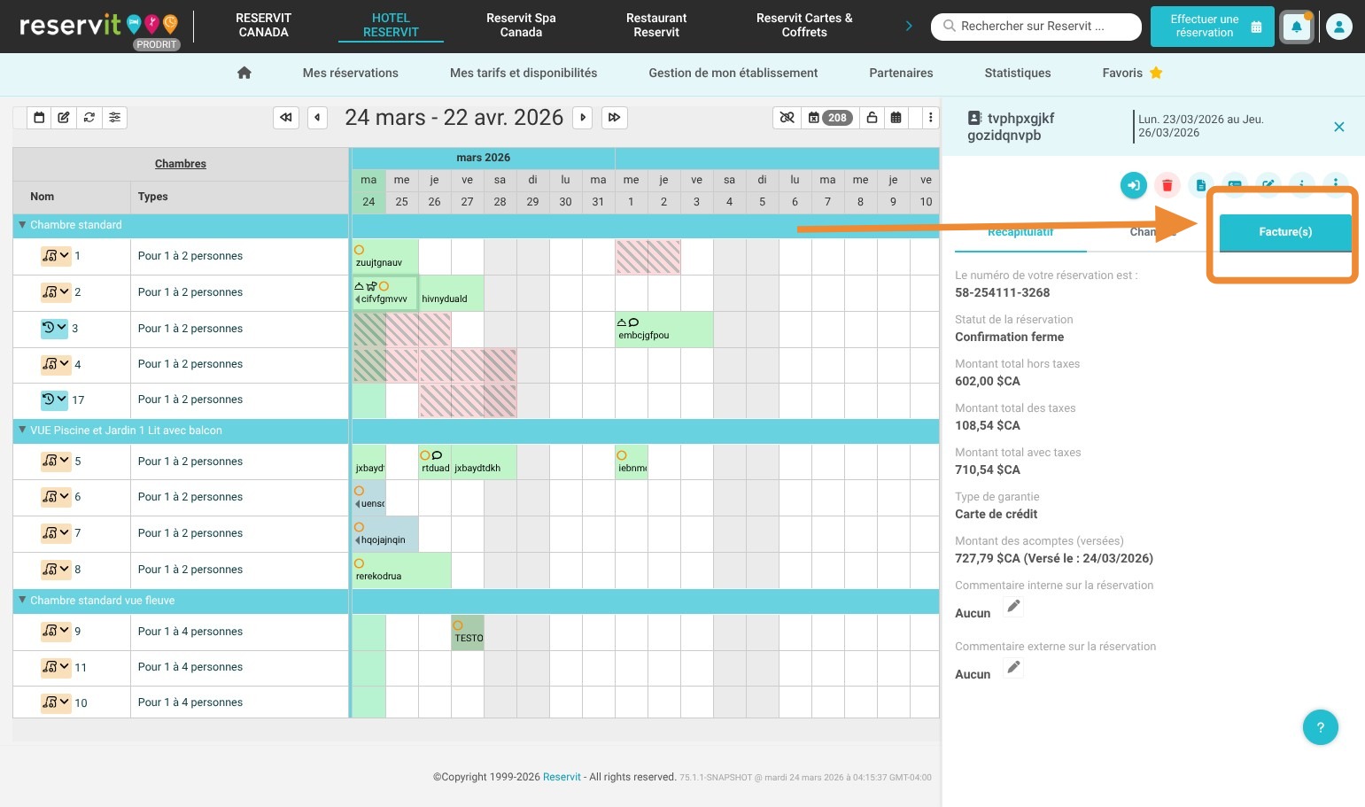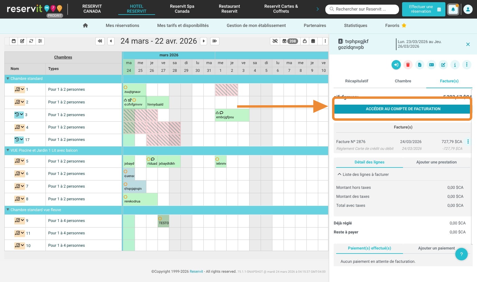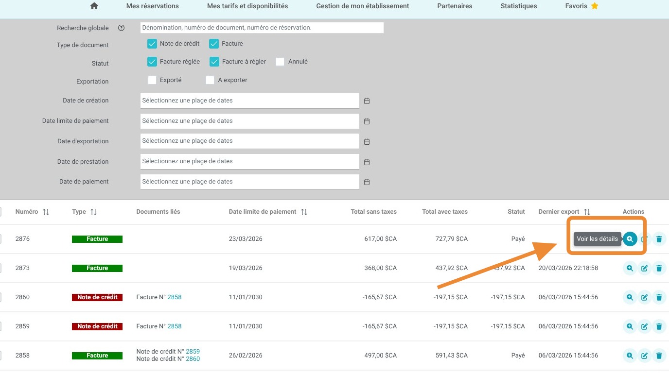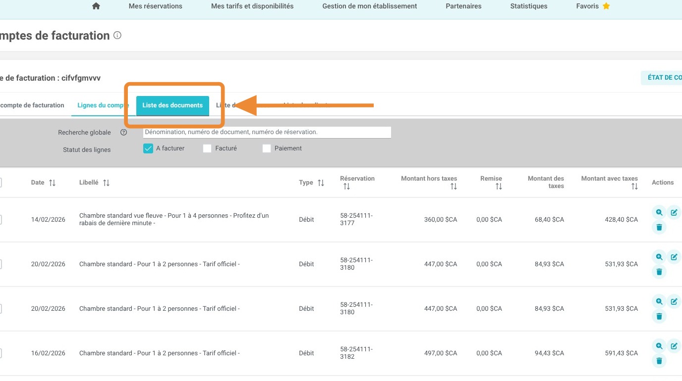 Accès à la facturation : Sélectionnez la réservation concernée et accédez au compte de facturation via la liste des documents.