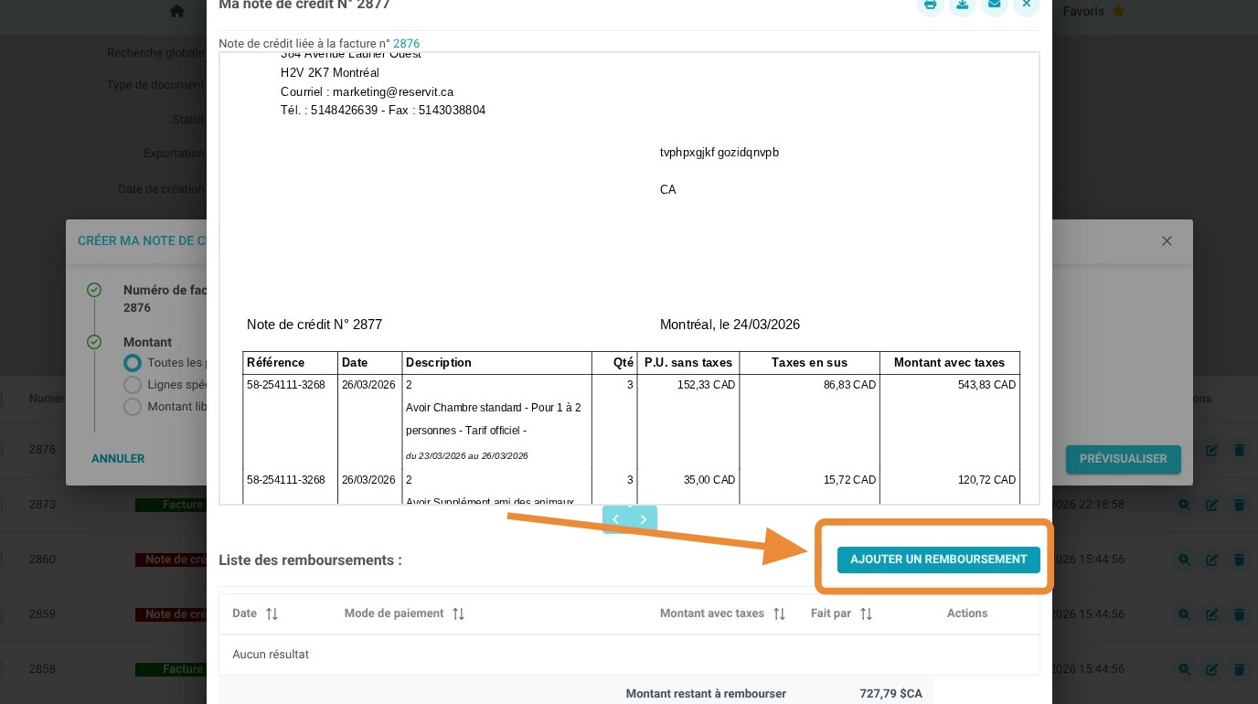 10. Maintenant que la note de crédit est émise (Avoir), nous allons émettre le remboursement relié. Cliquez sur "Ajouter un remboursement"