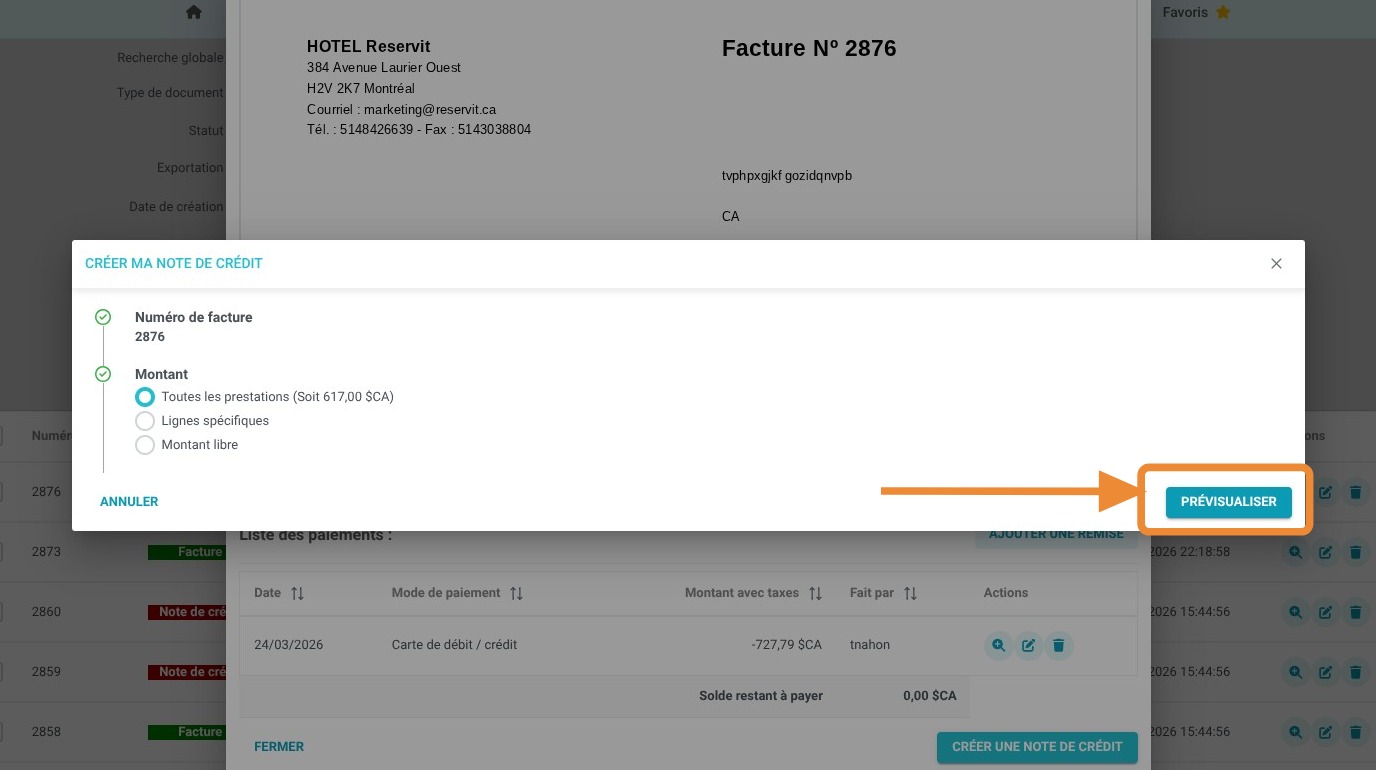 Validation du document : Choisissez le type de remboursement, prévisualisez le document pour vérification, puis validez la génération officielle de l'avoir.